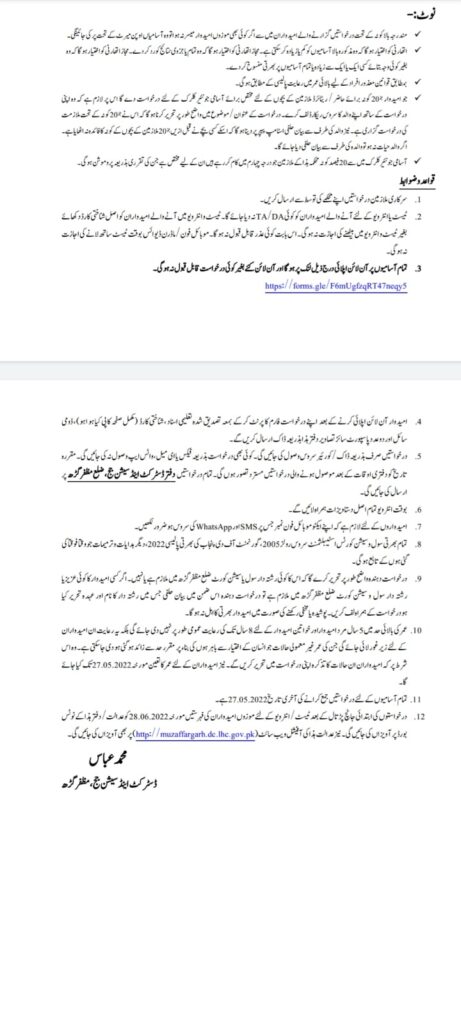 - Check online advisement https://muzaffargarh.dc.lhc.gov.pk/PublicPages/ViewPDFFilePublic.aspx?fid=9424&source=Annoucement&filename=27-04-2022-muzaffargarh-Muzaffargarh%20Advertisement%202022%20(2)pdf