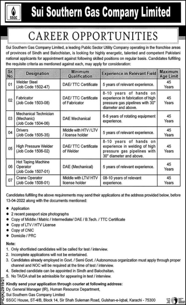 Sui Southern Gas Company Limited, a leading Public Sector Utility Company operating in the ballot areas of businesses of Sindh and Baluchistan, is looking for largely energetic, talented, and competent Pakistani public aspirants for appointment against the following professed positions on a regular basis. Campaigners fulfilling the needful criteria as mentioned against each may apply for consideration